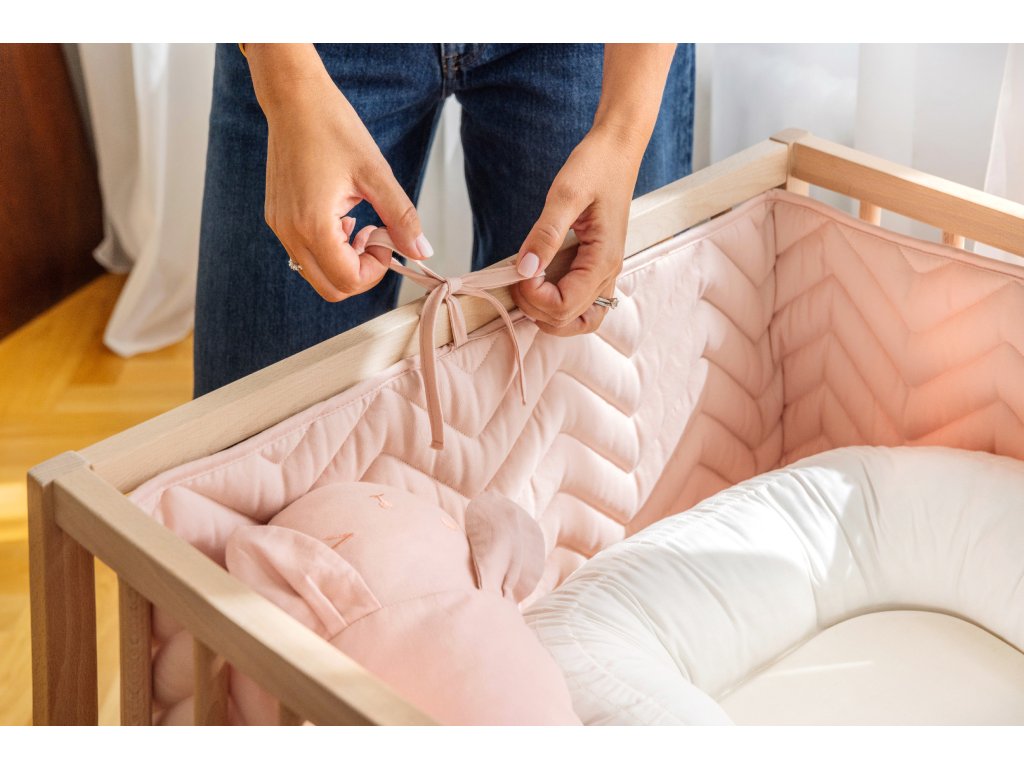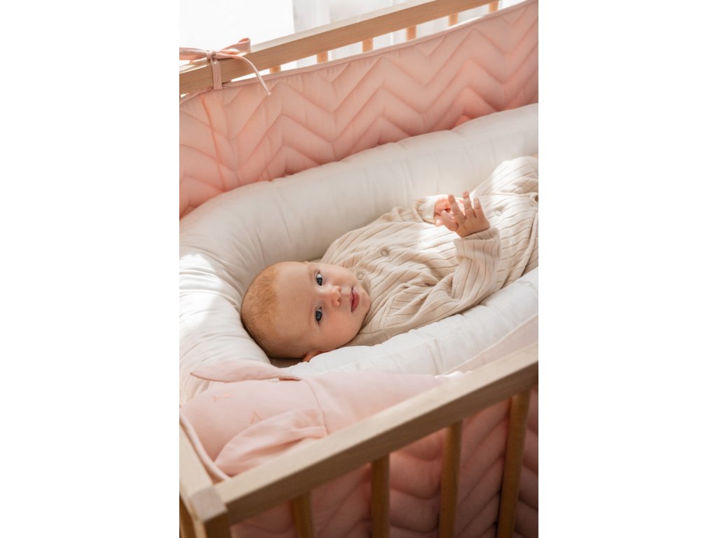 Bezpečné a krásné, takové by mělo prostředí dětské postýlky být. Extra měkký mantinel ze silné vrstvy bavlněného rouna zajistí, že se miminko neuhodí o konstrukci postýlky nebo neprostrčí drobné končetiny skrz její příčky. Oku lahodí i nadčasový design – baví nás prošívání v cikcak tvaru i praktické úvazy, které postýlce dodají kouzlo.