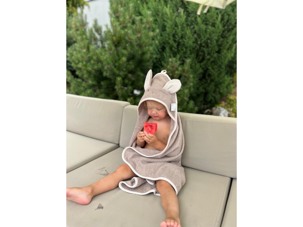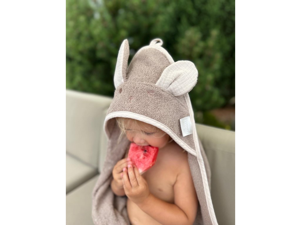 Zabalte do ručníku Vaše miminko doma po koupeli, venku po koupání v bazénu nebo hraní si v moři. Má ideální rozměr jak na cesty tak i na doma. Za kapuci ho poté jednoduše pověsíte na háček a necháte ho usušit.