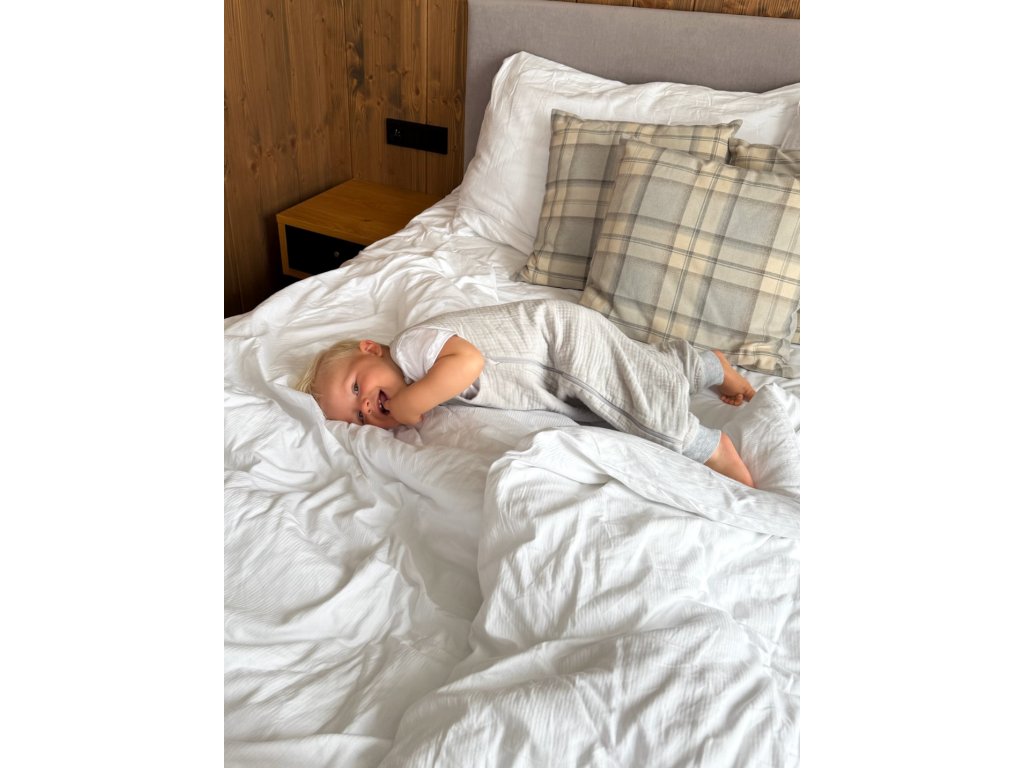 Overal na spaní s nohavicemi je perfektní volba pro batolata a menší školkové děti. Zajistí úplnou svobodu pohybu při spánku, ale zároveň se dítě v noci neodkope. Pro dítě jednoznačně nejbezpečnější alternativou tradičních přikrývek či deček. Díky tohoto overalu máte jistotu, že tvář vašeho dítěte nebude nikdy omylem zakryta a dítě bude mít úplnou volnost pohybu rukou i nohou. Overal byl navržen s důrazem na zdravý a bezpečný spánek. Navíc je vyroben z mušelínu, což je zcela přírodní látka a má skvělé termoregulační vlastnosti. V horkých dnech chladí a v chladnějších dnech pomáhá udržovat tělo dítěte v teple.